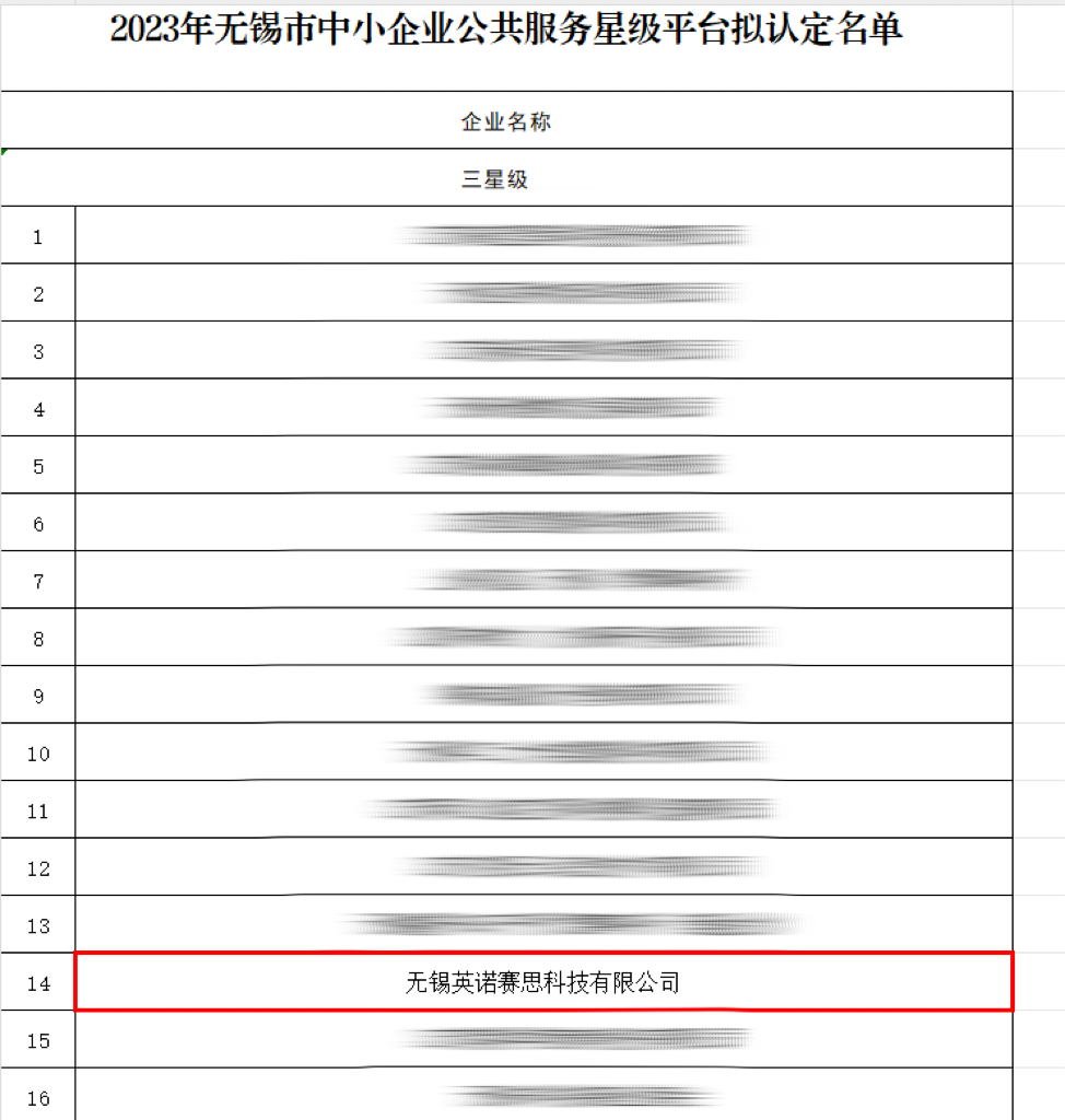 12月7日,無錫市工業(yè)和信息化局公示了《2023年無錫市中小企業(yè)公共服務(wù)星級平臺認定名單》,無錫英諾賽思科技有限公司榮列榜單,被認定為三星級平臺。