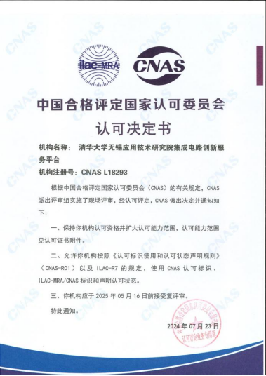 評審組按照現(xiàn)場評審計劃通過現(xiàn)場查看設備、設施場所、人員考核面談、現(xiàn)場試驗、查閱資料等方式,對管理體系的符合性、持續(xù)適應性和運行有效性進行了全面審核,對申請擴項變更項目的實際運行水平和技術能力進行了重點考評。評審組一致認為,清華大學無錫應用技術研究院集成電路創(chuàng)新服務平臺體系、儀器設備和檢測能力符合擴項評審的要求,能滿足所開展的檢測、校準工作需要,通過省級資質(zhì)認定現(xiàn)場評審并獲頒CNAS資質(zhì)證書。
